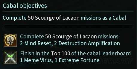 完成50次Scourge of Lacaon任务获得︰思维重置X2 , 毁天灭地X2