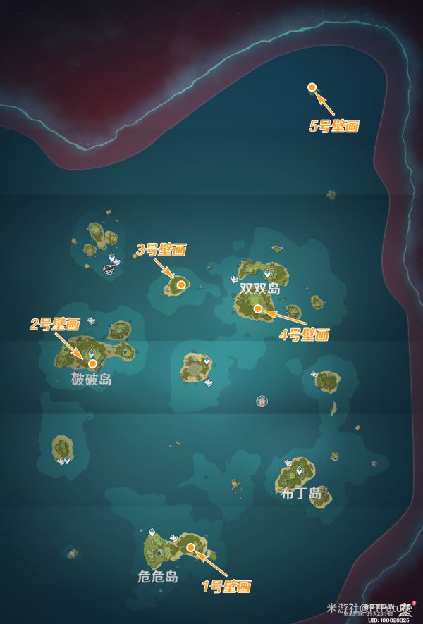 整个群岛共有5幅壁画,全部找到并拍照记录即可解锁任务的下一阶段。这里给各位旅行者展示一下5幅壁画在整个地图的所在位置,并依次标注序号,便于后文详细说明。各位旅行者可以根据自己的任务进度直接查看还没找到的壁画位置。