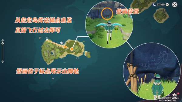 危危岛的壁画位于岛屿东侧山脚下的墙壁上,可以从危危岛的传送锚点直接飞行到达。