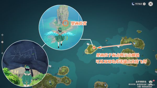 无名岛屿的壁画位于双双岛左边的小岛山脚下,也就是我们前面任务发现“前半截船”的小岛,可以从双双岛传送锚点直接飞行到达该壁画位置。