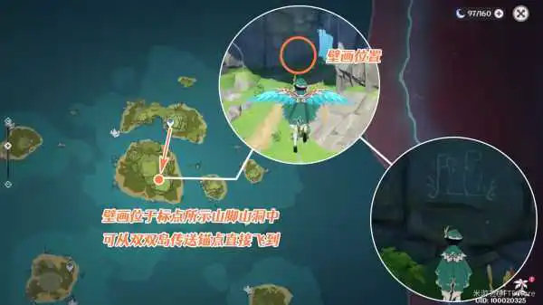 双双岛的壁画位于双双岛传送锚点南边的山脚山洞的东南侧,可以从双双岛的传送锚点飞行直接到达。