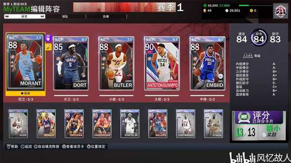 如果拿到奥多姆可以把巴特勒顶上分位,让奥多姆去小前。这套阵容的防守强度是很高的,基本你手操内线就足够了,后续如果还是吃力可以考虑把恩比德更换。13人末位放上鲨鱼和卡特莱特关键时候可以提升强度,这两张也是不错的内线卡。