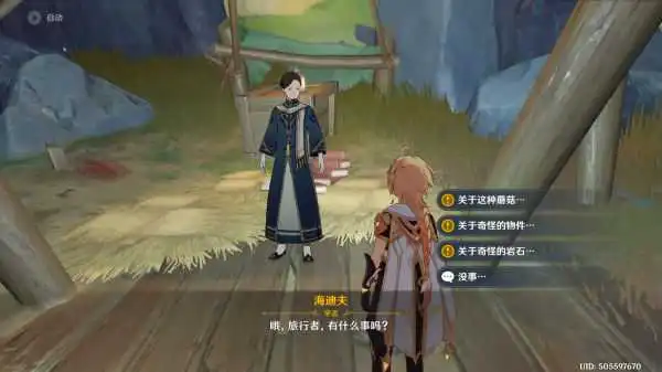 接着我们将采集好的8个星蕈交给海迪夫(选“蘑菇采回来了。”选项,其他两个是触发另外两个任务的选项)