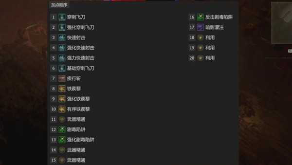 第一阶段为20级之前没获得任何关键传奇威能,此阶段可以左键穿刺飞刀,右键快速射击,具体天赋加点顺序可以按照这个点法。