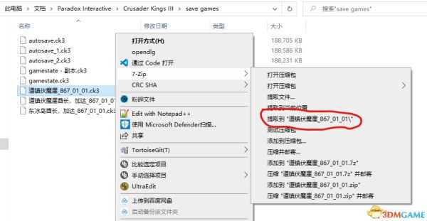 6.修改完毕后保存,并将后缀名改为.ck3,请注意这一步不需要重新压缩,直接将改好的gamestate.ck3拖回*:\Documents\Paradox Interactive\Crusader Kings III\save games