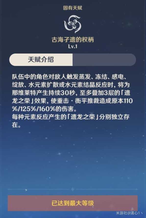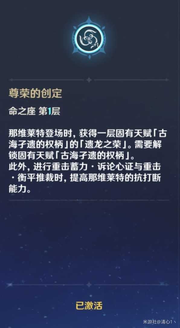 由于众所周知的原因,大家知道,龙王的1命很重要,主要原因有二:一是登场直接获得一层固有天赋「古海子遗的权柄」的「遗龙之荣」,类似于神子2命一部分特效,二是重击抗打断,获得战场霸体,两个特效都对之后的队伍有所优化,下面配队我会着重的去说。