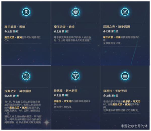 1命:E技能冷却时间减少20%。是性价比很高的一个命座,增加公子循环,可以缓解E技能超长cd的尴尬。