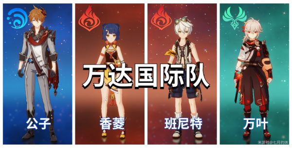 1. 目前主流的万达国际队,输出高,缺点是位置都基本锁死了。万叶位置可以用砂糖、雷神、温迪、钟离替代。