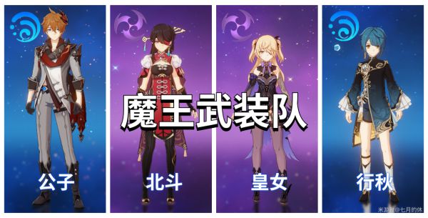 2. 魔王武装队,在万达国际队没出来前,就是公子主流的玩法,缺点也是一样,位置基本锁死。这个队伍强的不是魔王是驾驶员北斗+皇女。皇女位置可以用雷神替代,行秋位置可以用砂糖、万叶、班尼特位置替代。