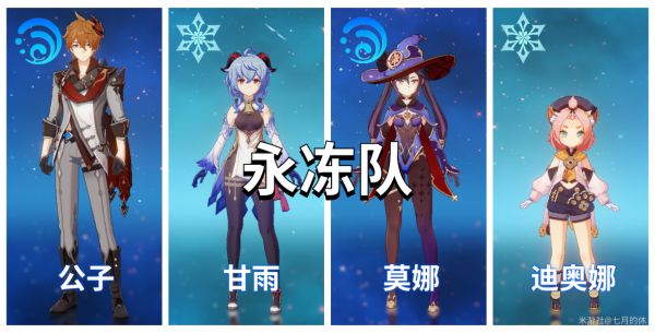 3. 永冻队,是比较容易上手且好搭配的阵容。甘雨位置可以用后台脱手冰替代比如罗莎莉亚(2命最好)、凯亚。莫娜位置可以用芭芭拉、心海、行秋替代。冰猫位置可以用七七、温迪替代。