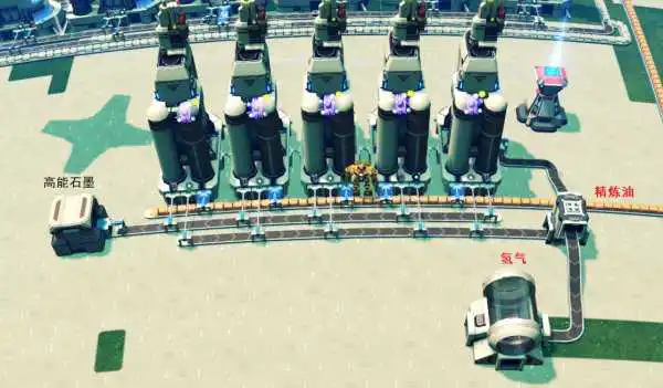 这样设计不需要引过来另外的氢气线,只需在开始的循环里面丢两个氢气让反应开始起来,氢气就会越来越多,只需要引一根精炼油线就行了。而且这样的设计可以特别方便的往后延申,只要不超过传送带速度就行了