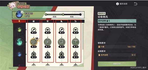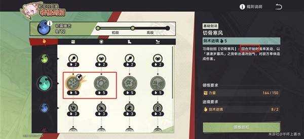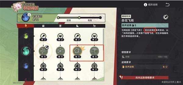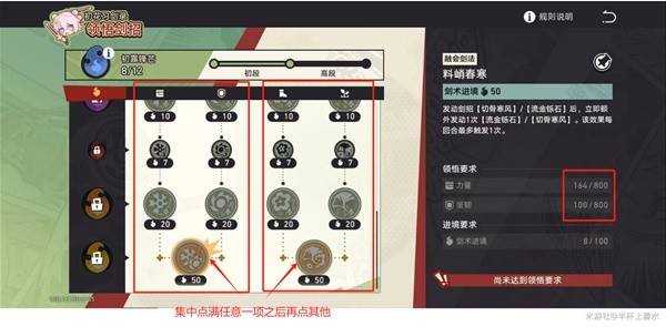 到万应灵丹关卡有【融汇剑法】需要优先将前两项或后两项优先点满,需要两项数值达到800点;