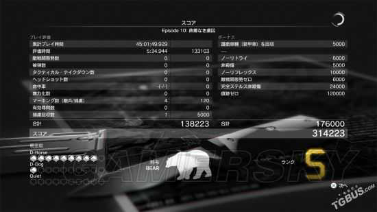 当然期间还有一些小项目的加分比如爆头1000分,CQC敌人1000分等等,至于完全无痕迹那个12万的加成有些苛刻,要求全程连被敌人感觉到都不行,好在13万分数要求不算苛刻,这个分数不要也罢。