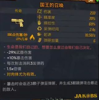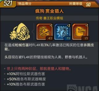 目前根据NGA整理的兽王传奇模组来看,仅有六个,比较适合速杀BOSS的推荐疯狗,一方面本身就会强化猎人之眼,增加面对BOSS的输出和生存能力,同时3%几率触发虽然很低,但国王的召唤暴击产生3颗跳弹也是可以触发攻击特效的,也就是说实际战斗哪0BUFF进战斗,也能完美的触发杀戮技能。疯狗本身所附带的三个技能也是非常实用,不存在废技能,技能等级随缘就行。有追求可以追求3条白字附加,国王的召唤属于雅各布斯武器,白字越多雅各布斯词缀约好。