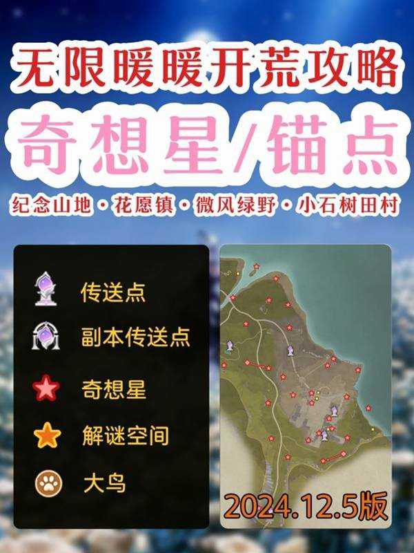 《无限暖暖》中的奇想星是一种重要收集品,并且数量较多,收集起来比较麻烦。下面为大家带来由“木易不高兴了”分享的《无限暖暖》奇想星与传送点位置标注,希望对大家有用。