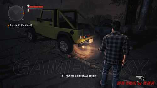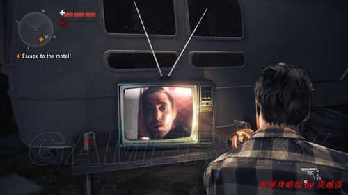 3.搜索四周.铁栅栏上贴着一张手稿.路旁卡车后的岩石上有一份手稿.名字分别是the splitter和pages and lnstincts.按F5可查看.周围橘黄色的车上有弹药和一把左轮.貌似是发信枪..继续四处搜索.白色的房车旁有个可以互动的电视.按E互动,电视里应该是黑暗所滋生的反派留给主角的录像,等汉化吧...自由度挺高的.继续绕了一会发现一只蛇皮手提箱,并提示武器和物品可以通过收集手稿来解锁.打开会发现一把冲锋枪.长按E会替换掉手枪.找得差不多了,进入旅馆,会在车库里看到妹子一枚.走近会触发剧情.我觉得这女的应该是小说中虚设的角色.而非真人.废话.主角也是游戏里虚设的角色.非真人.