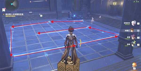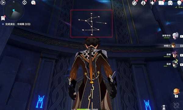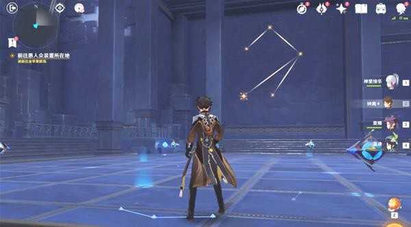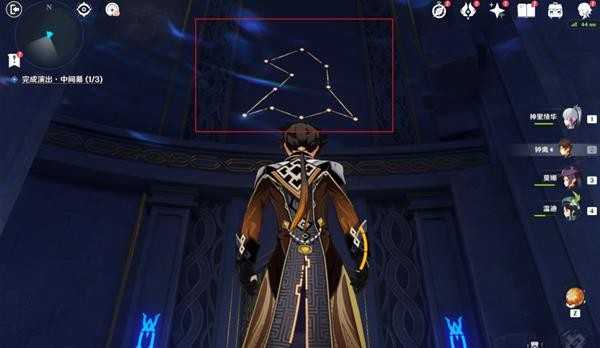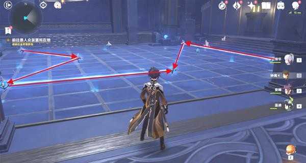 根据地面上星图的图案,操作踏板将天上的图拼成跟地面上一样完成解密,解密的顺序为:先踩中地板1下,再踩左地板2下,再踩右地板2下