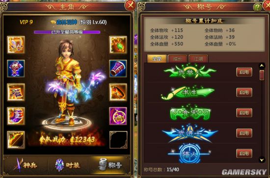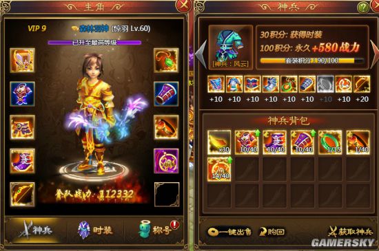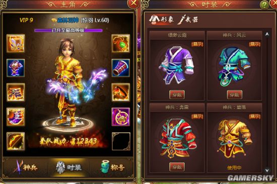 主角界面包括主角神兵、神兵图鉴、时装、称号四个功能,装备神兵可以直接提升全队战力,注意是全队哦!而集齐一套神兵则可以激活时装和时装属性,不同时装的属性还可以叠加,时装属性同样也是提升全队战力的。