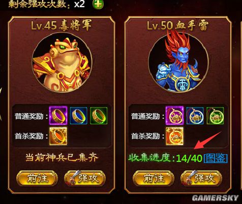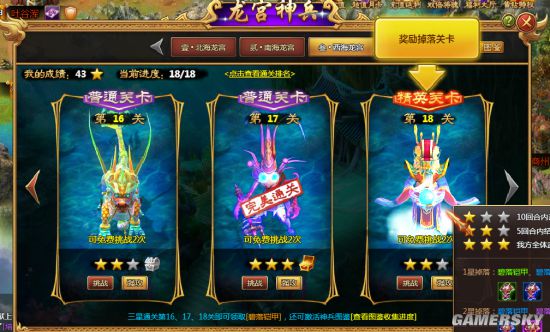 而其余金色神兵装备在“龙宫神兵”活动中,完成每三关同时三星,领取宝箱后才能合成一件完成的金色神兵,否则只能获取其余颜色的神兵