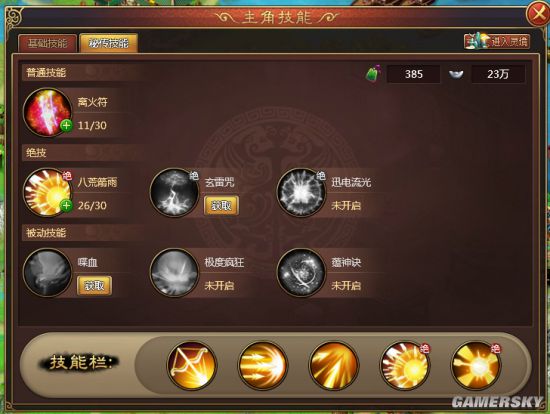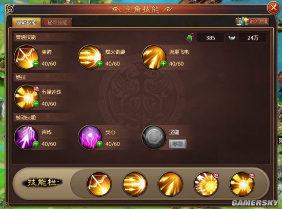按钮即可打开“主角技能”界面,分为“基础技能”和“秘传技能”两种,如下图所示: