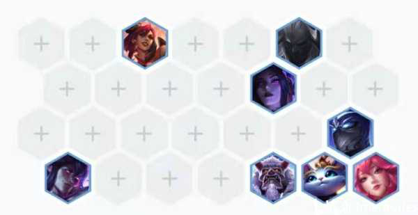 在站位上,狐狸沉底角吃悠米的圣杯,如果有刺客阵容慎可以带一个传送门防一手刺客,如果没有慎也可以顶到前排。锤石在底角吸引走位,猪妹和蛇女分散站位尽可能打更多的控制即可。