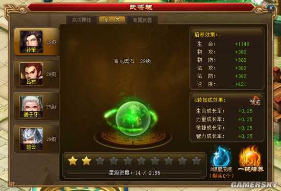 使用星辰泪对魂石进行培养,可以提升魂石的星级,魂石对武将的属性加成也会相应提高。游戏中还贴心地提供了“一键培养”功能,可以一次性使用十颗星辰泪对魂石进行培养。