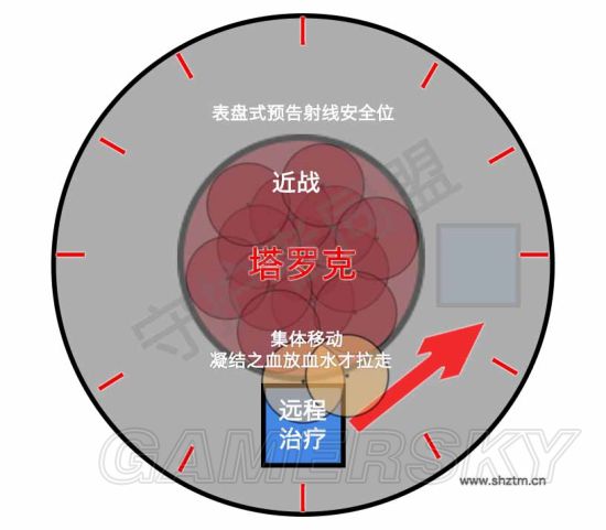 第二阶段全团和主坦克一起移动一起站位,切忌移动幅度过大,既浪费dps又浪费场地。小怪坦DKT最合适,可以抓。时刻关注预警坦克的站位,找他的位置把全团带过去。