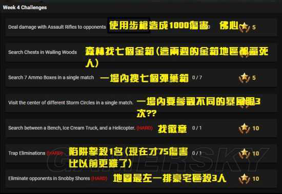 《堡垒之夜》第四赛季已经到了第四周了,越来越多的玩家加入到了本作当中,赛季挑战的奖励也是十分的诱人,请看下面的《堡垒之夜》第四赛季第四周挑战任务一览,大家一起来看看吧。