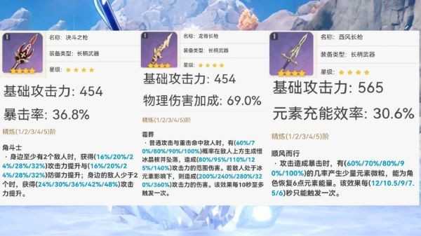 西风长枪:不如决斗枪,但决斗枪需要买纪行,不是很平民。罗莎莉亚八本身不是很缺充能,用西风枪目的主要是辅助队友充能。
