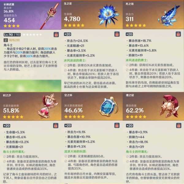 冰伤流玩法武器薙草之稻光、和璞鸢、天空之脊、决斗之枪、西风长枪、渔获、白缨枪等武器,圣遗物推荐宗室/绝缘/战狂4件套,or冰套/宗室/绝缘/角斗士/追忆/余响/辰砂2+2,攻击/充能沙,冰伤杯、暴击率头,充能160%以上,暴击率73%~88%,暴击伤害100%以上。