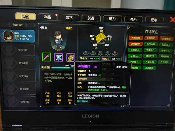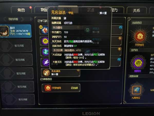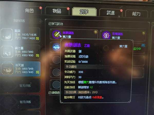 然后是天狼剑法,流血,力量加成,没太大用处,剑痴那边11点力量呢,等于没加成……