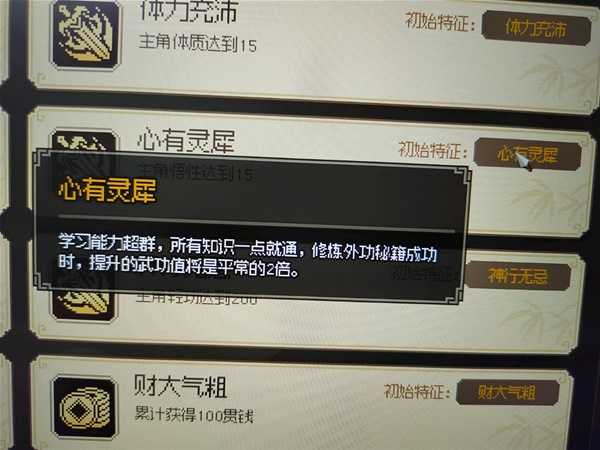 力量15时解锁的天赋,所向披靡,让你满血时必爆击必命中,很多情况下很强,单独看比身如鬼魅的收益要高,但是考虑到目前最终挑战目标是剑痴,他有反伤和流血,一次攻击后主角就不是满血了,效果和武道里点出首次攻击必爆一样,就没选这个天赋了