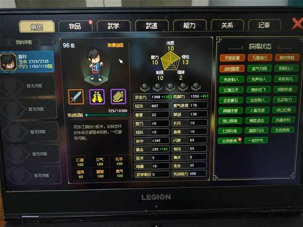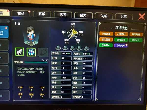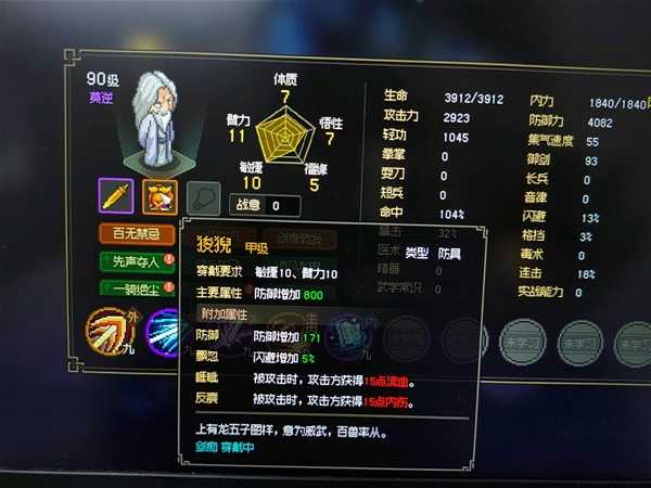 然后悟性,上面说过大约是每点悟性提升1等级数的攻击力以及1.15等级数的防御力,并且减少50内力上限,也就是说10悟性和1悟性开局相比,最终打桩切磋到100级时,攻击力相差900,防御相差1035,等于高了一套甲级装备了,只不过内力和连击低了一点。