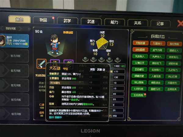 最后是体力,平平无奇,加血量,给你在越级挑战时增加一点容错率,比如剑痴燕子窝老大还有总捕头。另外6体力可以穿的上裘捕头身上的紫盔甲(另一个可获取紫防具是拍卖会蔡攸之身上有的紫披风,需要6敏捷),10体力或力量可获得楚襄城雕像的大石剑,还有就是内功选择了纯阳功的话,要保持80%以上血量来维持45增伤,高体力高悟性的血防在高等级时基本上可以撑住剑痴第一次伤害后还保持80%血量。