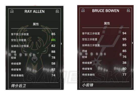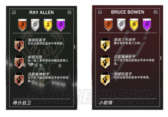 鲍文有我们前面提到的底线三分球手和接球投篮手金徽章,而雷阿伦只有接球投篮手铜徽章和射程无限铜徽章。虽然这组对比存在着诸多的变量因素,但还是能从一定程度上说明问题,就是徽章的有无和徽章水平的差异对于投手的三分命中率影响是极为巨大的。