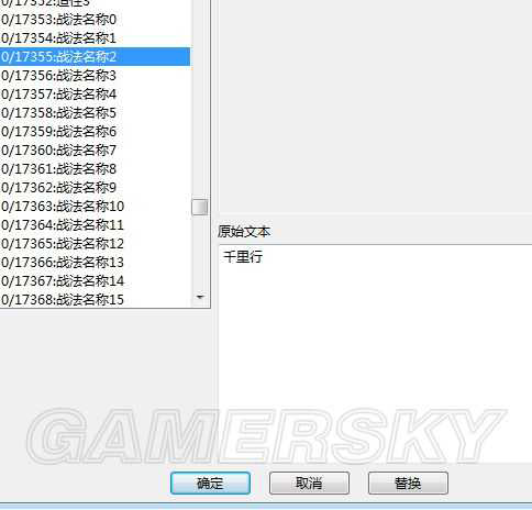 打开后向下拉~~翻到17353,就发现,到了战法名称修改的地方。直接可以点原始文本下的战法名开始修改,如,将17355文件署名战法名称2.原始文本下的军神,改为千里行。然后点原始文本下的替换,然后点确定,修改界面会自动关闭,这时修改就完成了,进游戏战法就会改变。