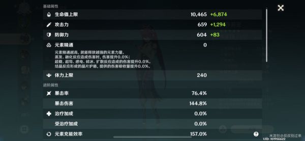 圣遗物都是我刷行秋的时候顺便凑齐的,我没甘雨别问我为什么手机玩。装备我个人建议暴击大于冲能的副词条,另外冰套四件套效果不知道是bug还是什么以及双冰队的暴击加成没法反应在面板上,也就没法透过元素爆发把15的暴击全部分享到其它角色,我的只有13就足够了。下面是我胡桃的属性。