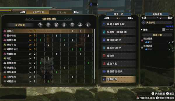 算上武器共剩余 2个2级孔,6个1级孔。两个2级孔加上护石实现纳刀3,剩下的6个一级孔可以出两个3级技能,个人推荐 耐绝3 和 砥石高速3,也可以根据自己的需求调整。