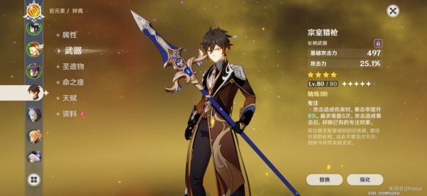 总体来说我对于钟离的强度整体上来说是比较失望的,并没有达到设定中“七神”的强度。钟离很难塞入目前已经成型的现有元素体系当中,但是未来仍有可开发的空间,最后附了我的钟离的面板,因为之前屯了材料直接抽出来就拉满了,武器没有五星枪,所以选用的是星辉换的那把副词缀+攻击的枪,圣遗物肯定不极品,但是50/145+的属性应该后期大家人人都是能达到的(我没岩伤杯,用的是攻击杯)。