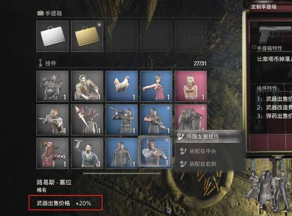 路易斯挂件,出售武器价格+20%,乍一听很牛啤,实际上,这20%并不包含强化费用,只是枪械无强化原本售卖价格+20%,属于实用性比有些白板挂件都低的拉胯玩意儿。