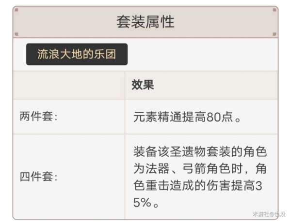 魔女二件套提供15%的火元素加成,乐团二级套提供80点元素精通。是楼主认为的胡桃最佳毕业方案。