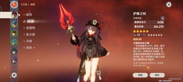 护摩可以提供高额的暴击伤害,胡桃十分需要的百分比生命值加成,以及生命转换攻击,在残血的时候还可以进一步增强攻击力,与胡桃本身的技能机制可以说是完美的契合。以楼主的胡桃为例,29000血量(80级未突破)在吃满半血buff的情况下,能够获得522点攻击力的提升,对于胡桃来说,护摩之杖就是毕业武器的最佳选择。