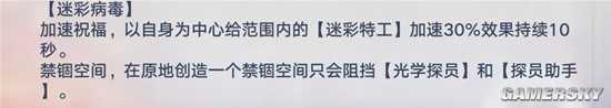 形成一个圆柱区域,触碰边界会对光学探员造成眩晕,同时还可以给周围迷彩特工进行加速。