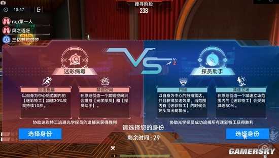 前三名被抓的迷彩特工,可以选择成为,探员助手,但是第四名默认成为迷彩病毒,后边就是每个身份的介绍。目前来看,光学探员胜率不如迷彩特工,不过玩法体验上更好玩一些(个人感觉),如果探员助手也能抓人,那就有来有往了,好在最后奖励不影响(下图为抓一半人奖励)。