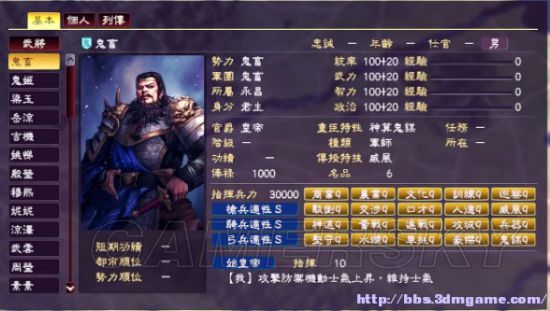 为了体现出BOSS的威力 把自虐最大化 本人上来直接修改器把他的主城钱粮人口兵役科技全满 然后官位用SAN大修改器直接设置成皇帝 名马跟全能力加十的宝物直接都给了他 这样四维120已经是大陆最强了(未来有突破上限的修改器之后 本人会尝试把他四维加到200 那才是真!最终BOSS)