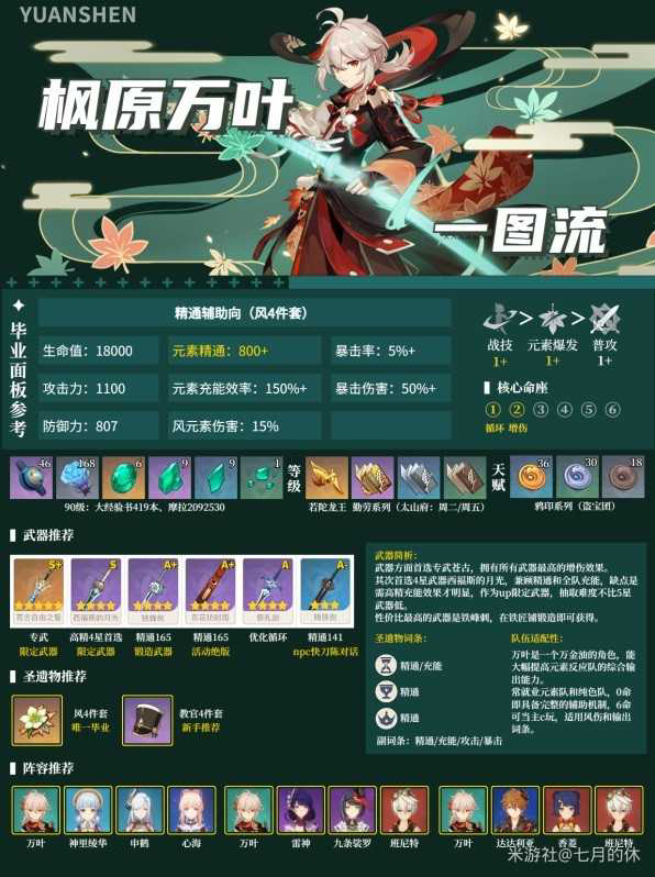 万叶作为辅助使用,可以不用管自身的直伤能力,只需专注堆精通,不仅提高增伤能力,且扩散伤害还可以给队伍补输出。所以,也就不需要升级天赋,培养成本低。