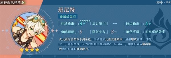 火元素综合型单手剑角色。兼增攻与治疗为一体的强力辅助角色,在绝大多数队伍搭配中都可以看到他的身影。班尼特既可以堆叠“生命与充能效率”来成为辅助角色(这也是他的通用定位),也可以作为常规火元素输出角色了来培养(特殊定位)。