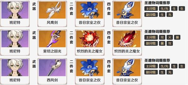 第一种搭配是班尼特元素爆发增攻最大化的选择,如果充能有压力,可以考虑佩戴充能沙漏或将武器换为「天空之刃」。
