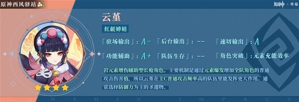 岩元素增伤辅助型长枪角色。云堇和申鹤在V2.4登场之后,后续都和“普通攻击”为主要输出手段的五星角色一同up,上一次是与「神里绫人」,这次就和「宵宫」一同up了,策划们的池子安排还是很到位的。