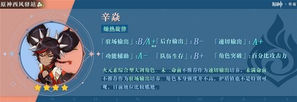 火元素综合型双手剑角色。辛焱「元素战技」可以产生基于自身防御力数值的火元素护盾,搭配固有天赋,可以增加该护盾保护下队友的物理伤害,开启第四命之座后,还可以减少被元素战技命中的敌人的物理抗性;她的「元素爆发」看似火元素伤害十足,实际上物理伤害倍率占的比重最大。